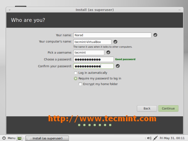 9. Type user details like name, desired username and password to login post installation, click on ‘Continue’.